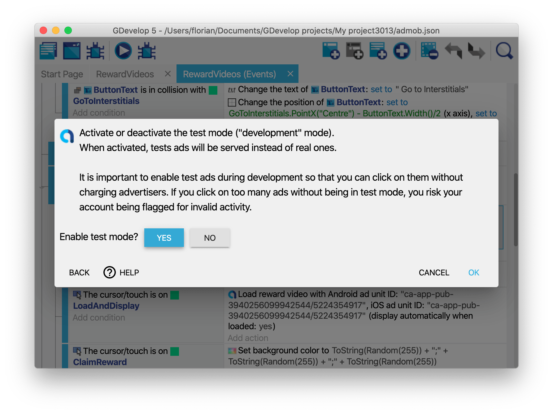 See how the ads work in a game by opening the example called AdMob. Replace the app id and the ad unit identifiers in the actions to test with your own account.