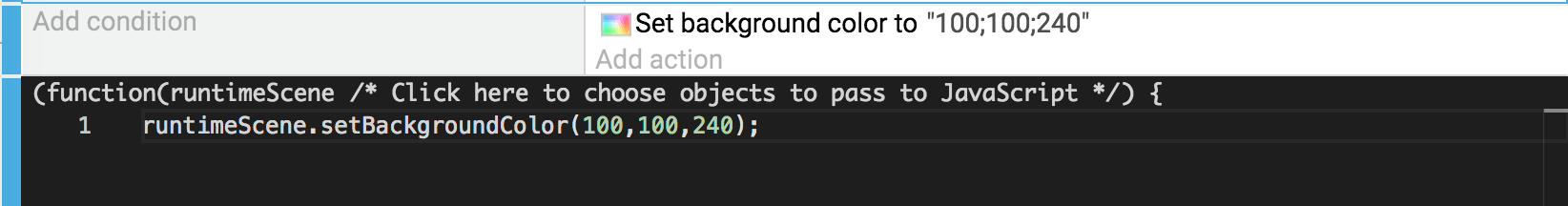 . This variable represents the scene being played. Below is an example of a standard GDevelop event, and an equivalent event that uses a JavaScript: