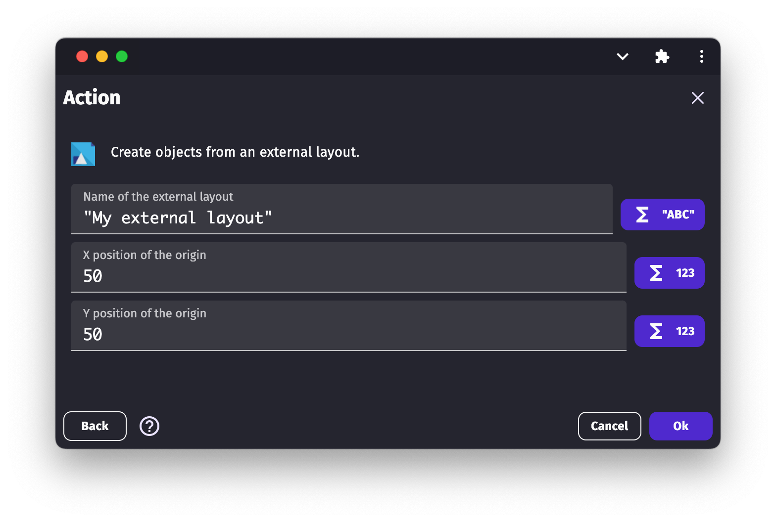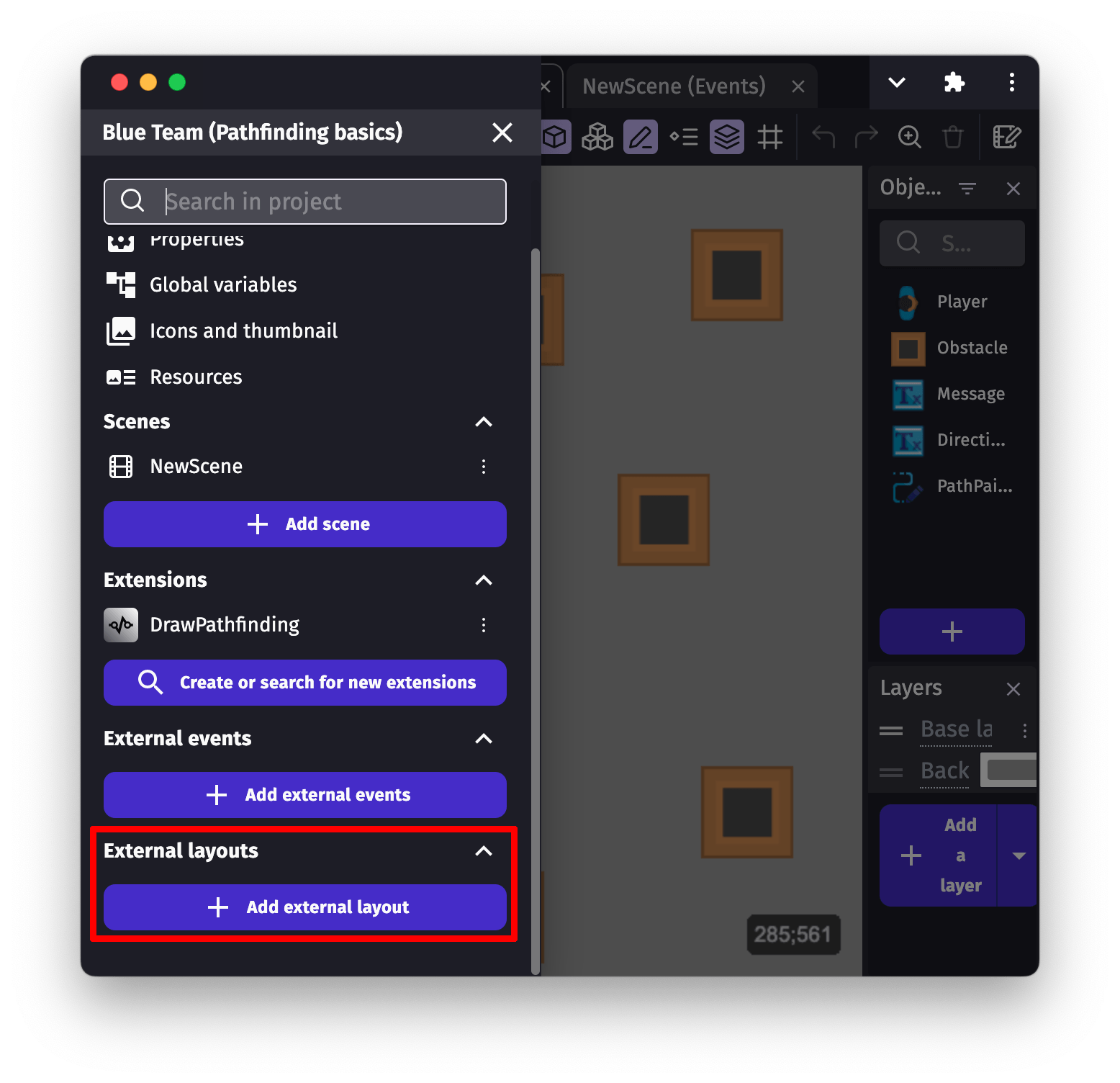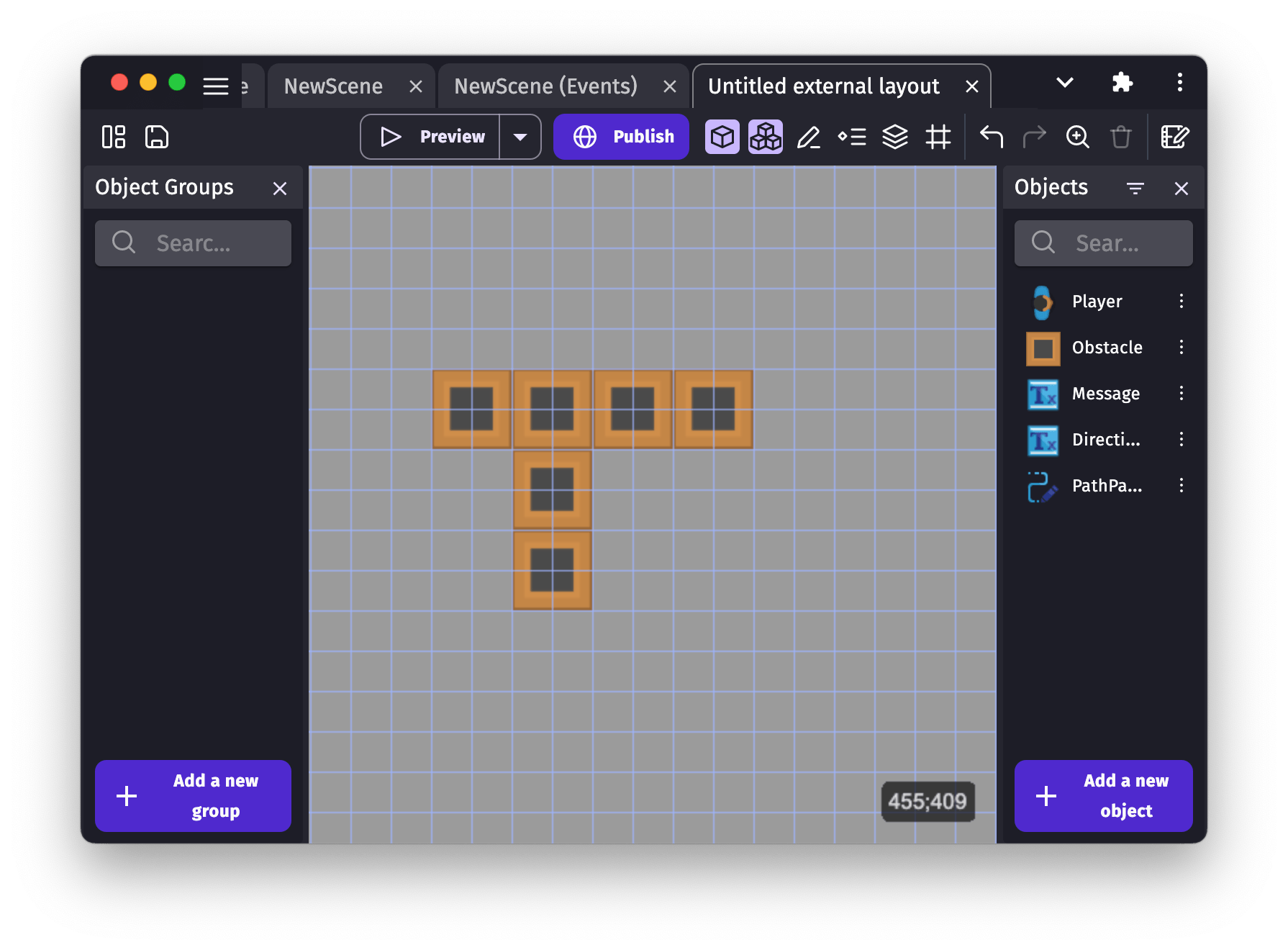 An external layout can be used to create a layout of objects, in the same way you would in a scene editor. Objects in an external layout can then be dynamically loaded into a scene using the action Create objects from an external layout.
