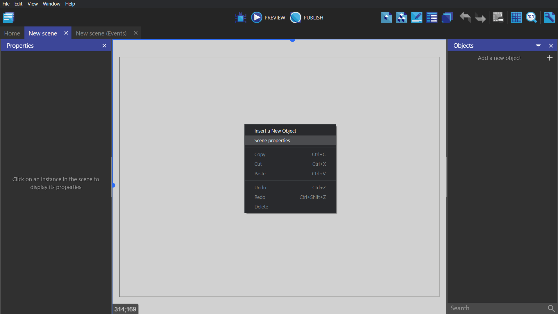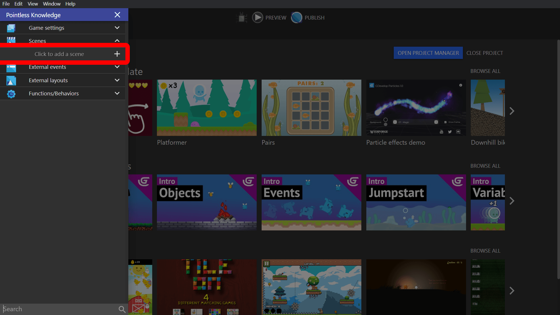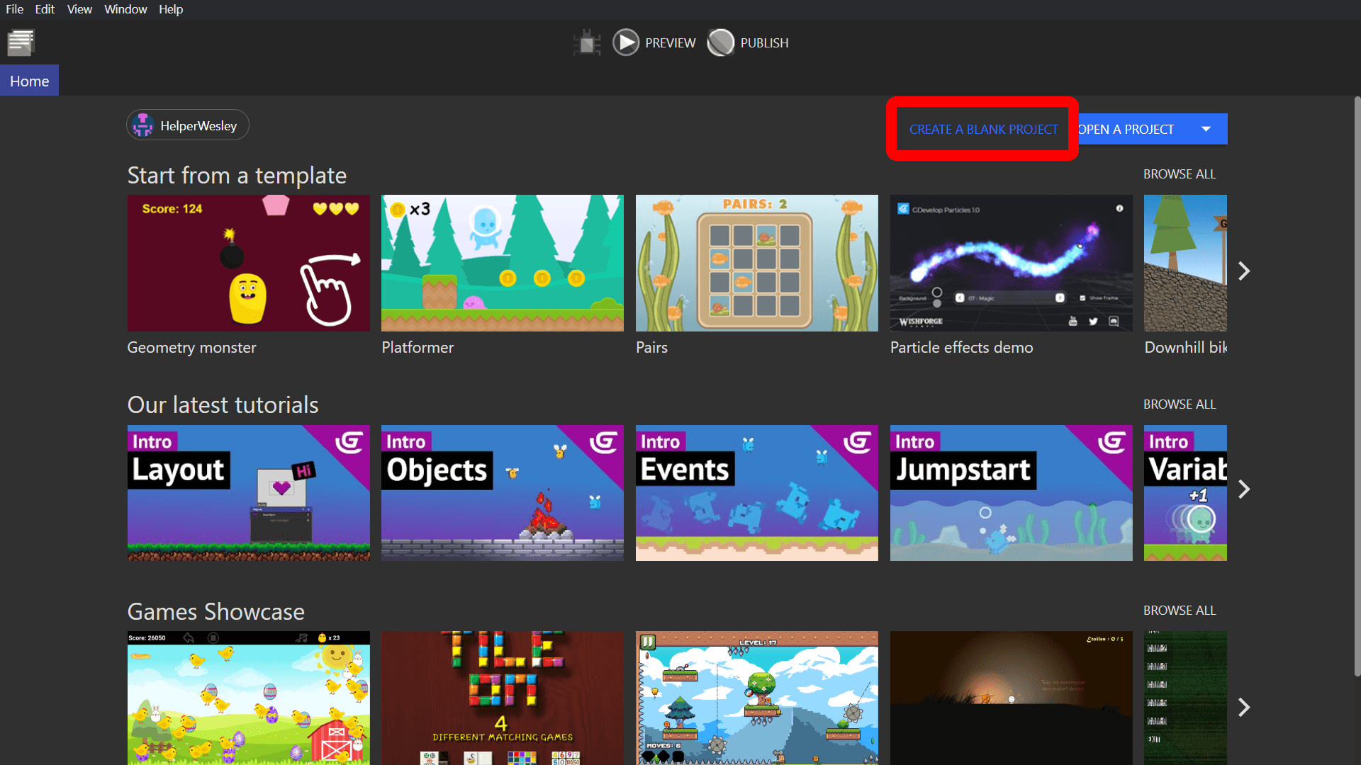 Open a blank game project in GDevelop