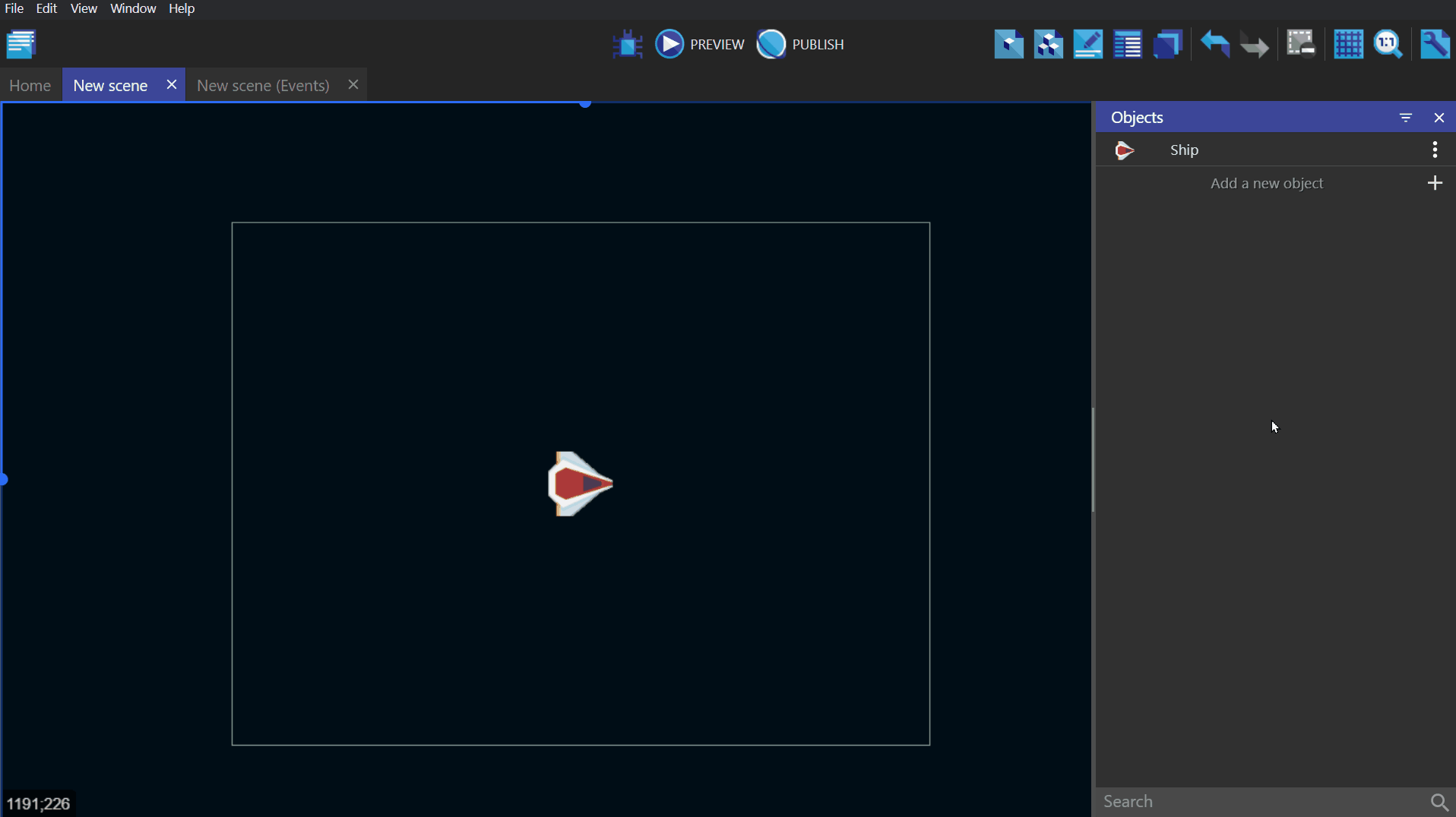 - In the bottom example, the first event deletes all the "Ship" objects from the scene/screen. It then creates one "Ship" at the coordinates X: 100, Y: 200 (100;200) on the base layer. This pair of events will display a single ship on the screen. (Behind the scenes, the ship is being deleted and recreated on every frame, which is not something you would want to do in a real game.)