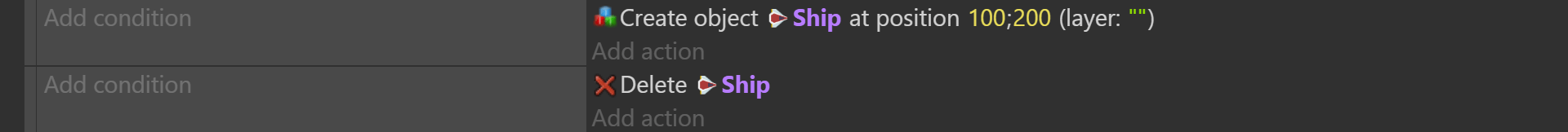 - In the top example, the first event creates a "Ship" object at coordinates X: 100. Y: 200 (100;200) on the base layer. Then the next event deletes that created ship immediately. This pair of events will not display a ship on the screen, because the ship is deleted right after being created.