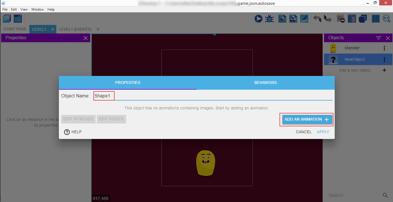 Do the same for the second shape: "Shape2" as the name, "NewObject2" as the animation, and a square image, then "Apply".