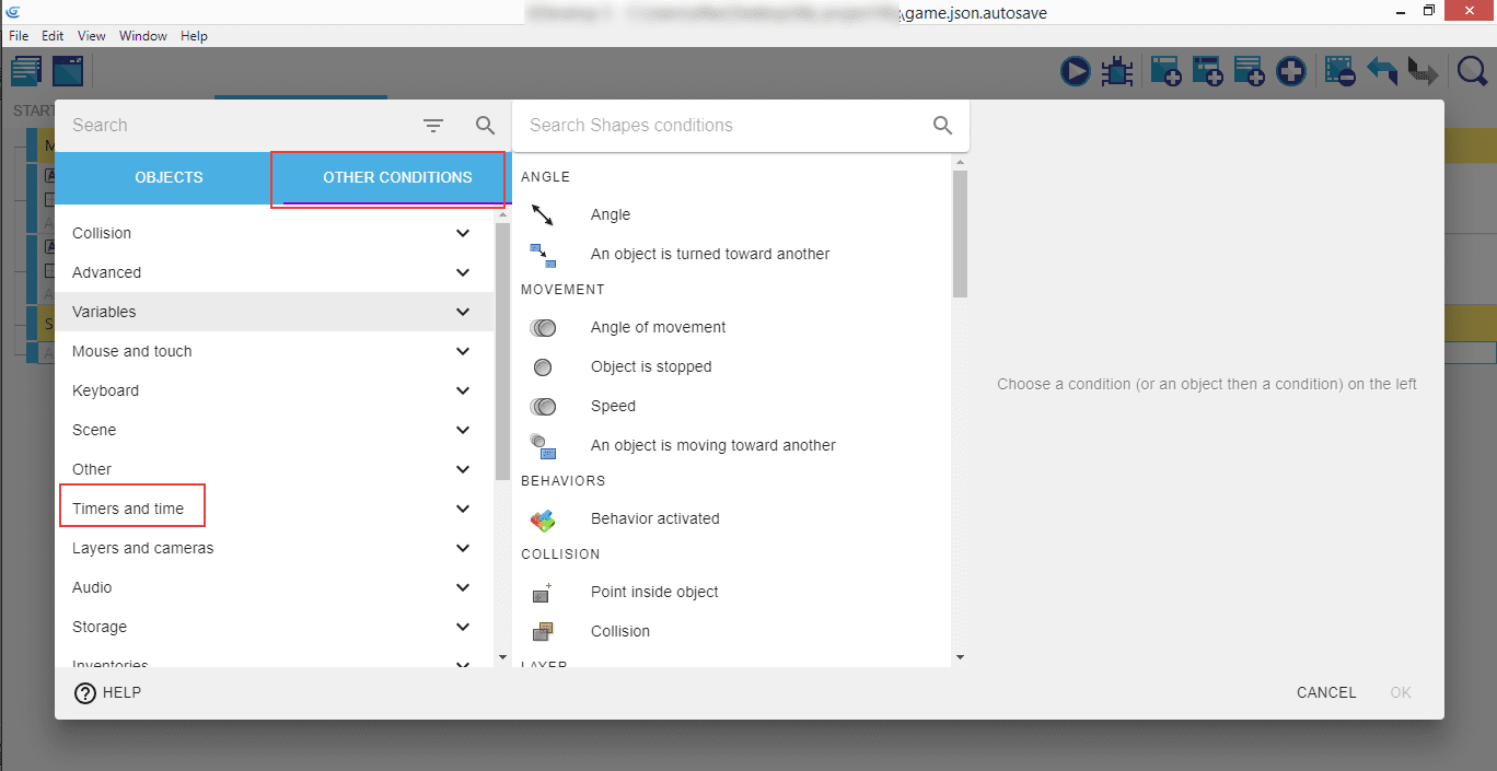 Don't have the "Other conditions" tab? Don't panic! Go to GDevelop preferences (Click on the "File" (or "GDevelop 5" on macOS) menu, then "Preferences". Activate "Use the new action/condition editor". You can then go back to the tutorial.