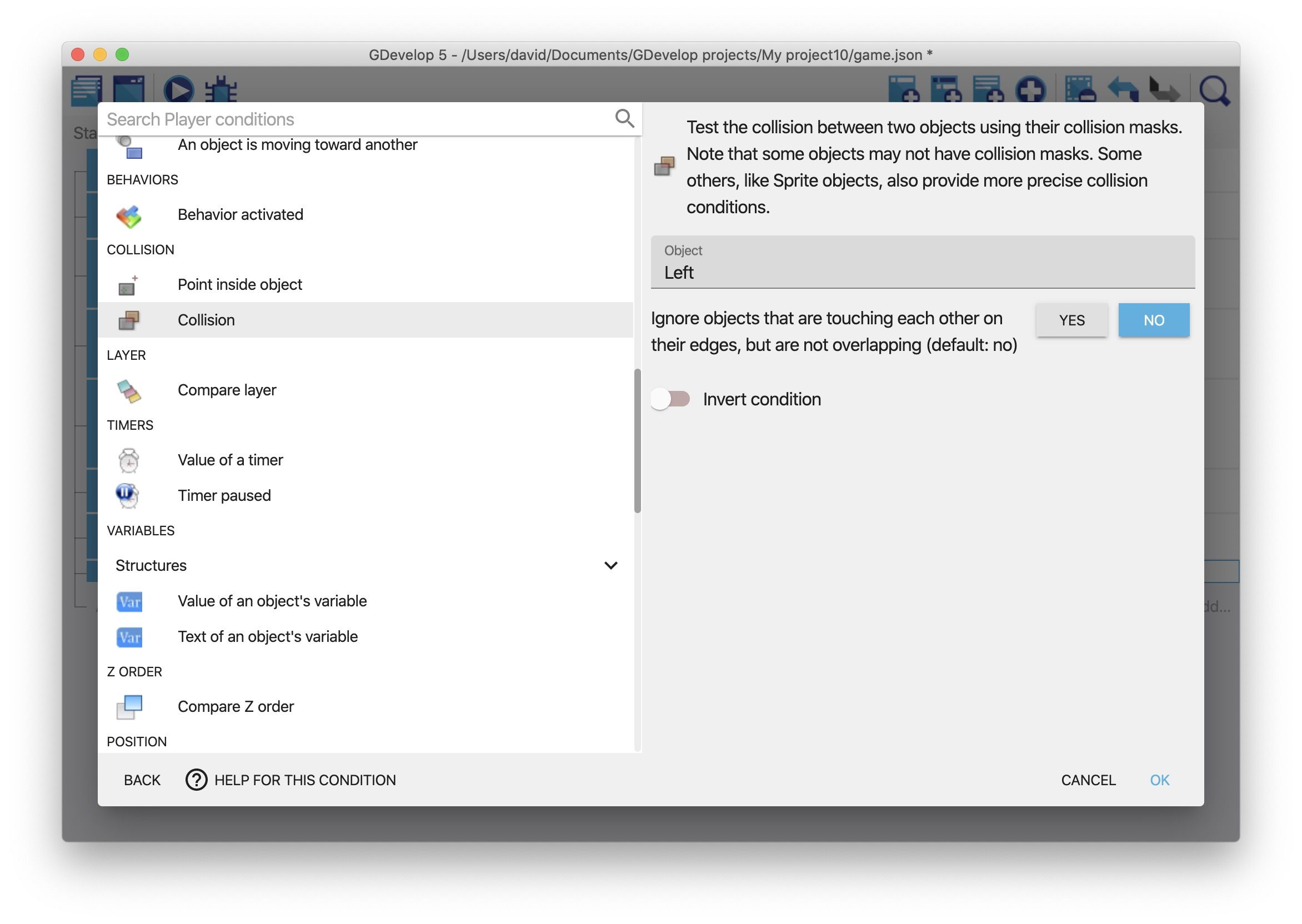 - Add a Collision condition that checks if the "Slime" object is colliding with the "Left" object.
