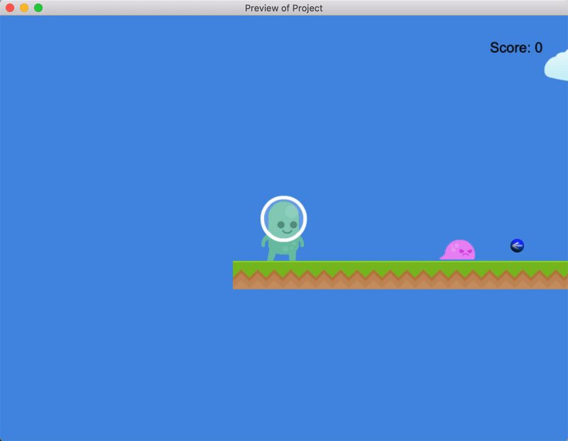 Based on this event, while the value of the "direction" variable is "right", the "Slime" object moves right. Because the object never changes direction though, it inevitably falls off the edge of the platform.